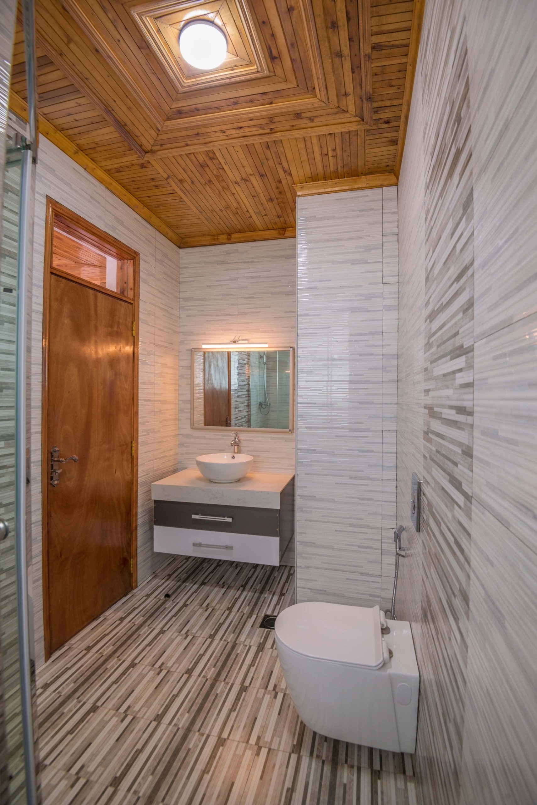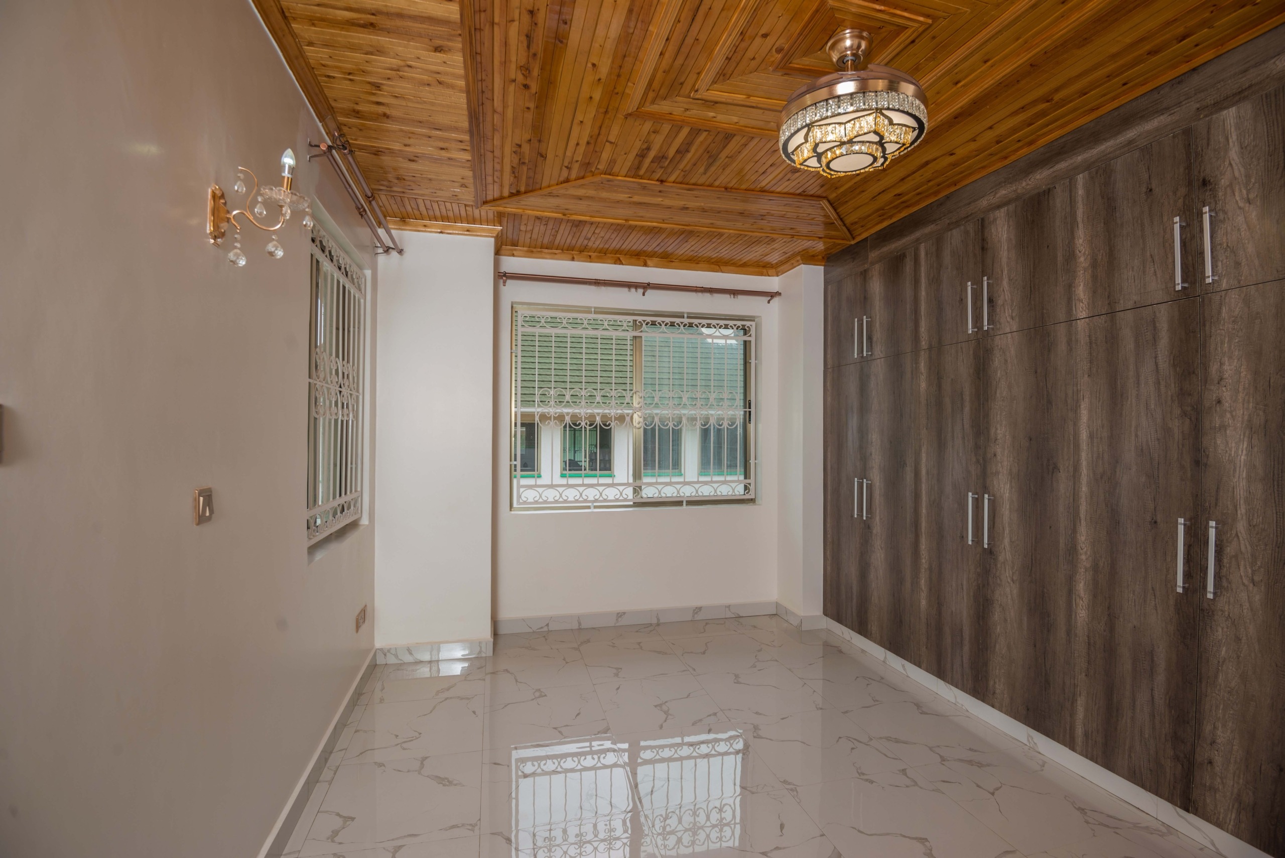 The home has six generously sized bedrooms, all en-suite, each fitted with built-in wardrobes and warm wooden ceiling finishes. The master suite includes a luxurious en-suite bathroom and ample storage. All bathrooms feature glass shower cubicles, modern fittings, and spa-style tiling.